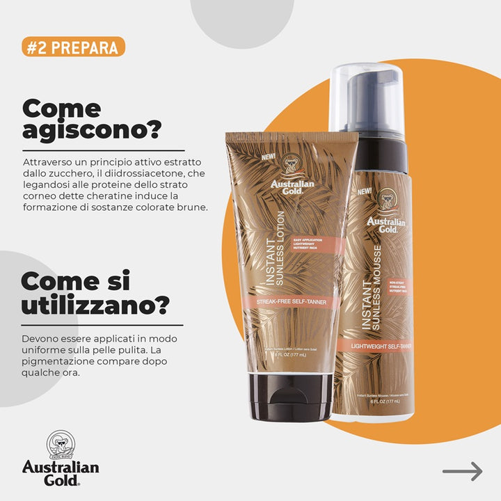 Formulazioni di ultima generazione che sfruttano Zucchero, Eritrulosio, DHA e Caramello per donare alla pelle un immediato e superficiale colore ambrato che si intensifica in 24 ore. Ideali per chi ama l’abbronzatura senza l’esposizione ai raggi UV.
