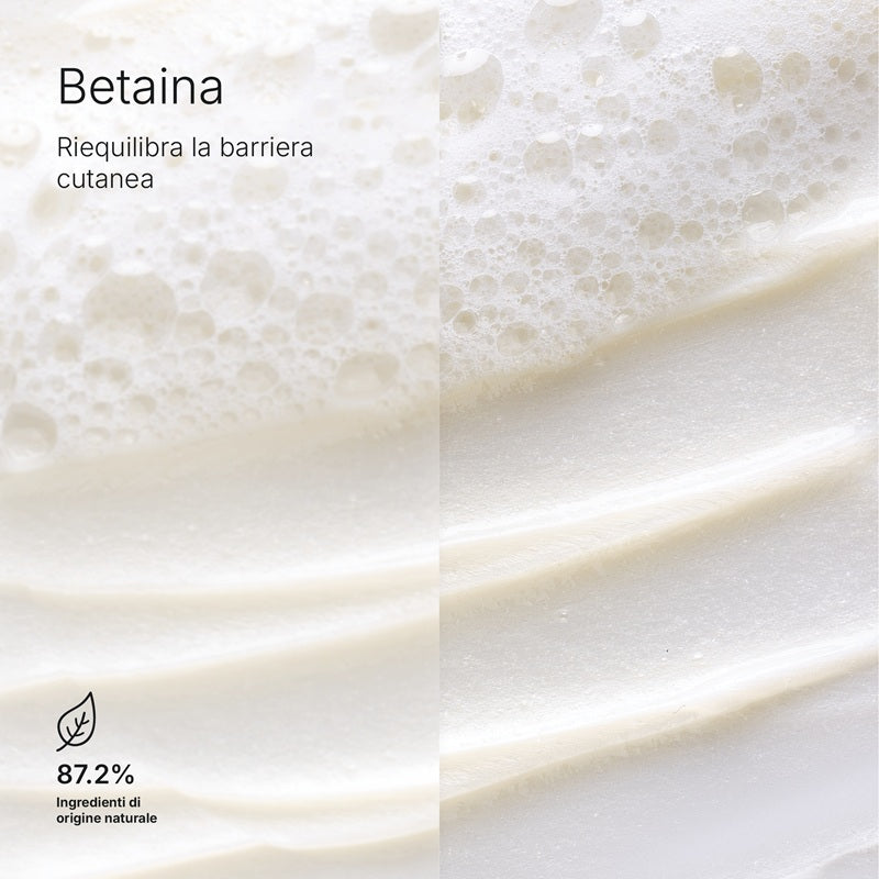 La formula è arricchita con betaina, un osmolita naturale noto per la sua capacità di rispettare e mantenere l’equilibrio cutaneo. Questo ingrediente aiuta a proteggere la barriera della pelle, rendendo il detergente adatto anche all’uso quotidiano e alle pelli più sensibili.